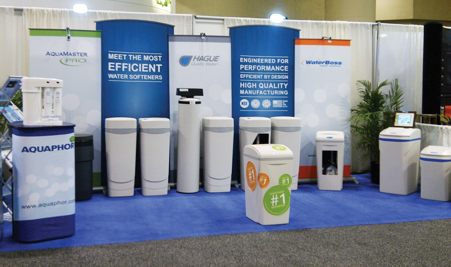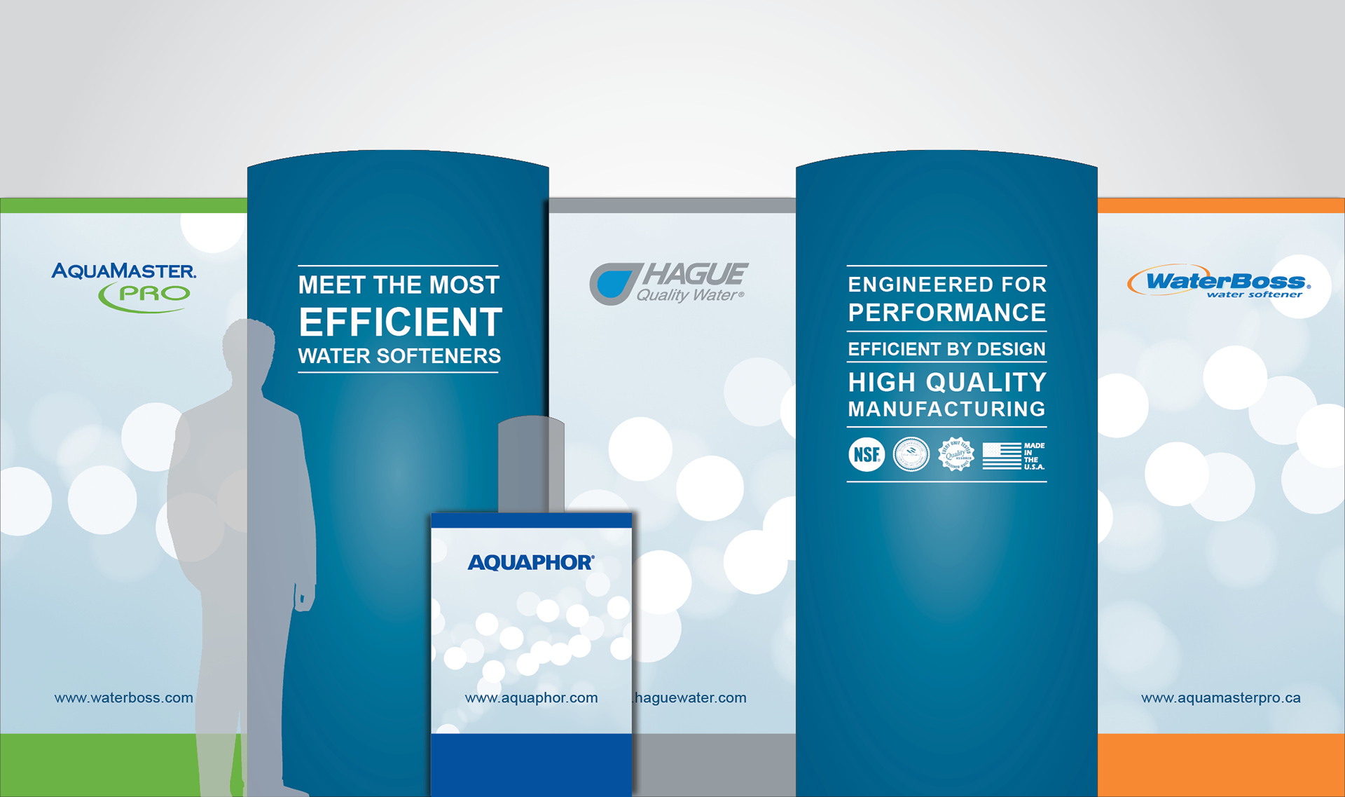 Problem Design a display that would stand out from other water softener companies. Solution Less is always more especially when it comes to water. A simple message and key points with a supporting background that lets the products stand out.